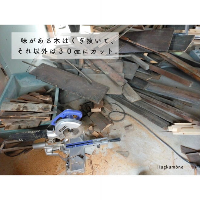 味のある木材は釘を抜いて残し、要らない木は、薪にするために30cmにカット。