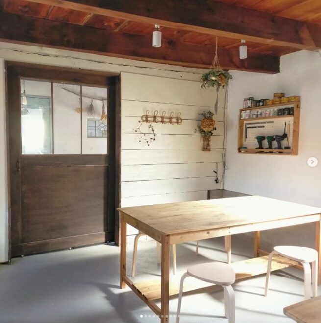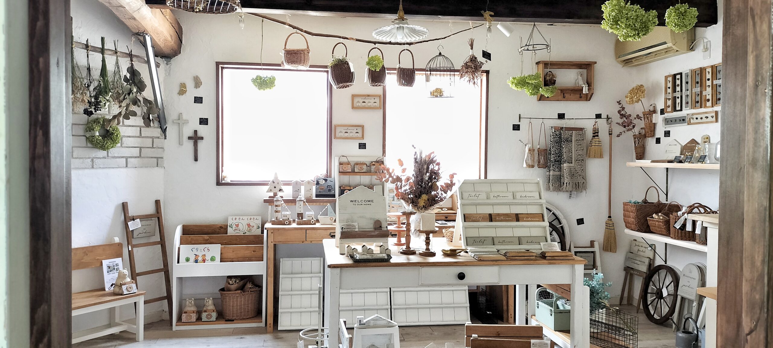 店内は古い納屋をセルフリノベーションした、ナチュラルアンティークな雰囲気のショップです。